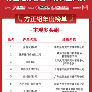 本年度荣获方正组主观多头策略前三名的是平阳圣盾资产管理有限公司旗下“圣盾火星8号”、威海芝麻开门私募基金管理有限公司旗下“芝麻开门成长型二号”以及北京久阳润泉资本管理中心(有限合伙)的“润泉1期”。
