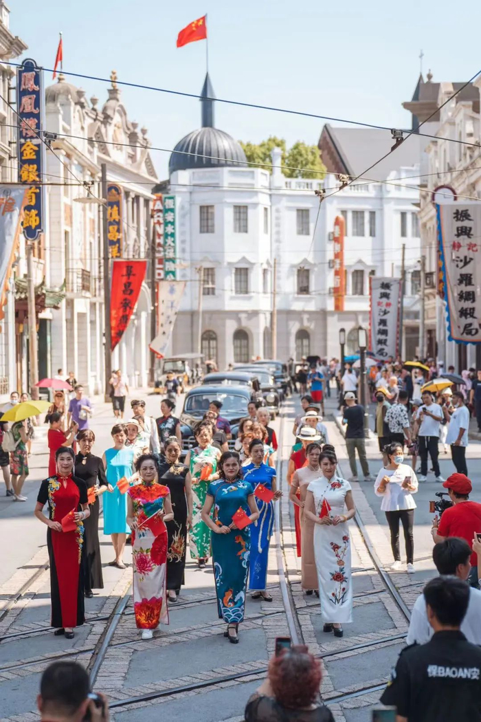 即使天气炎热,新青年们脸上还是洋溢着自信的微笑,一步一摇之间走出了百乐门风情万种,将东方气质与华贵挥洒到极致!