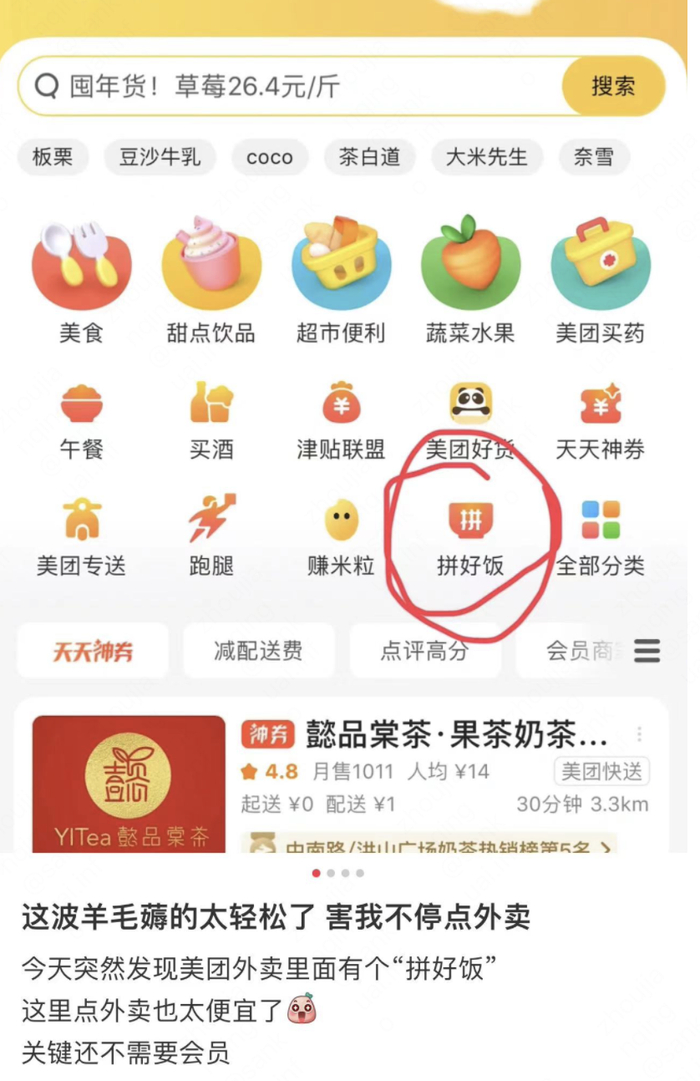 最近,在不少平台看到别人发吃午饭省钱小妙招,其中一个方式就是使用美团拼好饭订餐。小妙招里写,平时20多块钱的饭,在拼好饭里买也就10来块钱,堪比外卖版的团购。