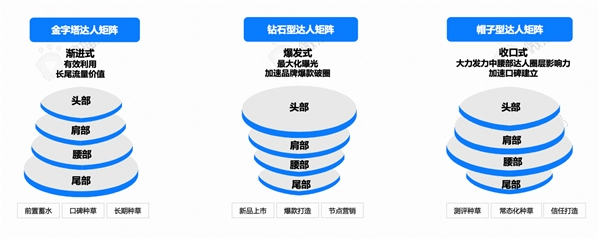 在实践过程中,面对品牌在扩圈曝光、互动连接、效果转化、长效经营等方面的营销场景,磁力引擎也从系列案例中,总结出了“金字塔”“钻石型”“帽子型”三种达人投放模型,满足品牌不同营销需求。其中,金字塔达人矩阵有效利用长尾流量价值,满足品牌前置蓄水、口碑种草、长期种草等需求;钻石型达人矩阵通过最大化曝光,加速品牌爆款破圈,满足品牌新品上市、爆款打造、节点营销等需求;帽子型达人矩阵通过大力发挥中腰部达人圈层影响力,加速口碑建立,满足品牌测评种草、常态化种草、信任打造等需求。