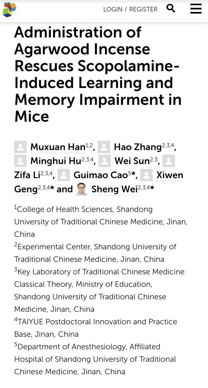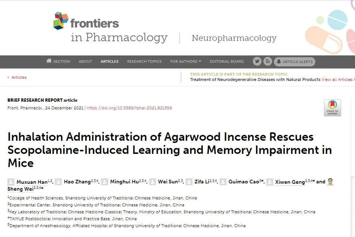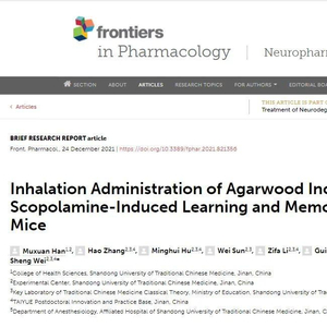 近日,太樾博士后基地魏盛教授团队发表了题目为“Inhalation Administration of Agarwood Incense Rescues Scopolamine-Induced Learning and Memory Impairment in Mice”的研究论文。该期刊是专门刊登药理类研究的SCI收录期刊,在业界享有较高声誉。该期刊是SCI 1区,2020年影响因子5.881,据不完全统计,此次也是沉香领域研究成果所发表的最高级别期刊之一。本次研究成功的证明了在沉香熏香环境下,实验动物学习记忆能力明显改善,是太樾在沉香发展方向上的又一次重大突破。