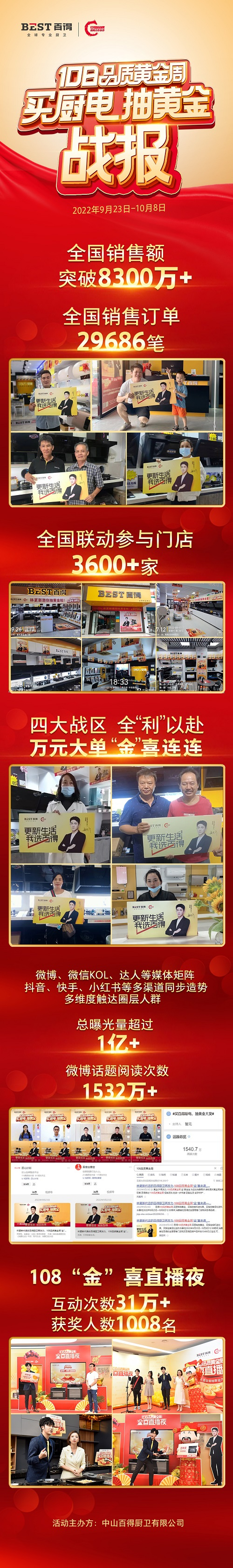 好品牌搭配好玩法,自然会收到良好的反馈。据统计,在黄金周期间,百得全国销量突破历史记录,参与人数创新高,创造了传播的高光时刻,巧妙地以丰厚奖品激励的形式,实现品效合一,“108品质黄金周”活动完美收官。