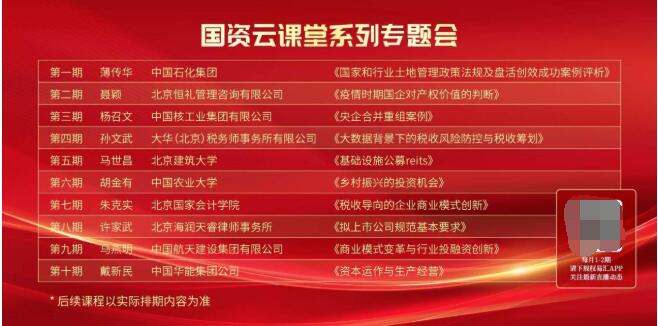 预计至2023年1月“国资云课堂”系列培训将会以每月1-2期的频次定期持续开课,课程将紧密围绕当前国资管理热点话题,包括国企改革、基础设施REITS、税务筹划、资本运作等内容邀请业内专家进行讲解和分享。同时为了可以更好的服务于国有企业改革和存量资产盘活,为国有企业从业人员及各级管理者提供更专业、便捷的培训服务,计划每年将会开始20-40期线上专题讲座、举办2次以上大型行业峰会。