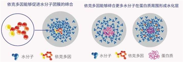 除此之外,依克多因 本身由于刚刚提到的缔合水分子能力,使得水分子在其周围定向排列,改变水分子的空间排布,形成了一个“盾牌保护”效应,外界因子等不易侵入和产生刺激,自然让皮肤可以静下来修复自己,降低应激反应和损伤。