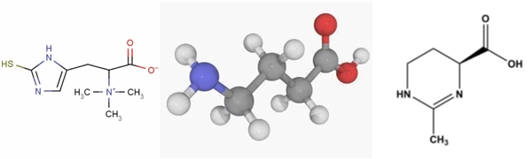 麦角硫因、GABA、依克多因的化学结构(从左到右)