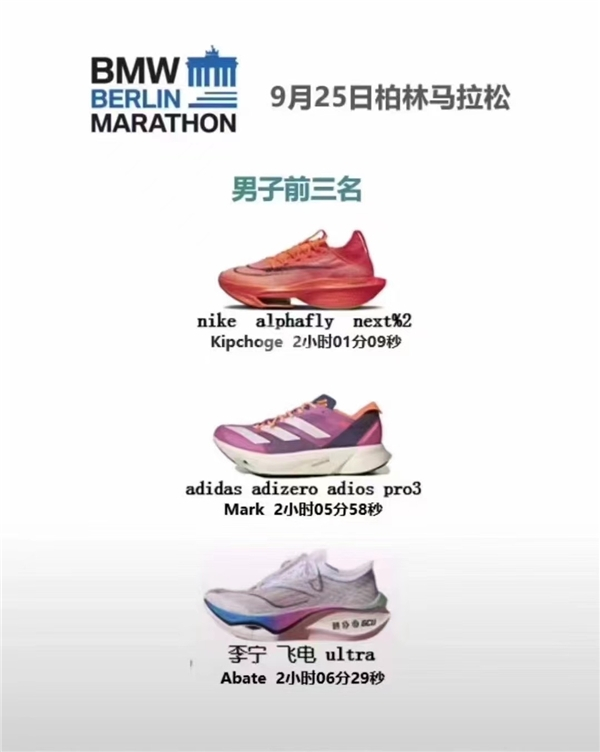 2022柏林马拉松赛中,埃鲁德-基普乔格刷新自己的赛道纪录,前AC米兰、皇马球星卡卡顺利完成首马,更有来自埃塞俄比亚的运动员塔杜-阿巴特(Tadu Abate)脚踩李宁飞电3 ULTRA,获得男子第三名并登上领奖台,李宁跑鞋也由此刷新了中国跑鞋在世界马拉松赛事的最好成绩。