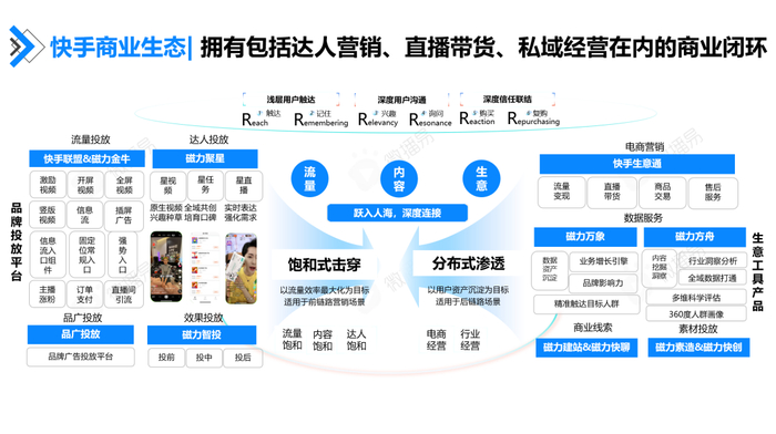这里既有市井偶像、也有双栖明星;既有市井特色达人,也有职人群体;既有卖场型达人,也有精品买手,报告基于新市井/新势力创作者酿造的差异化内容生态,强化“人+内容”特色,基于快手6R人群基础,利用达人商业化内容,兼顾流量获取、内容影响和生意促进,实现从用户触达-建立兴趣-实现购买-促进复购的全链路影响。报告对达人营销模型、电商运营机会、私域运营方法论分别展开呈现。