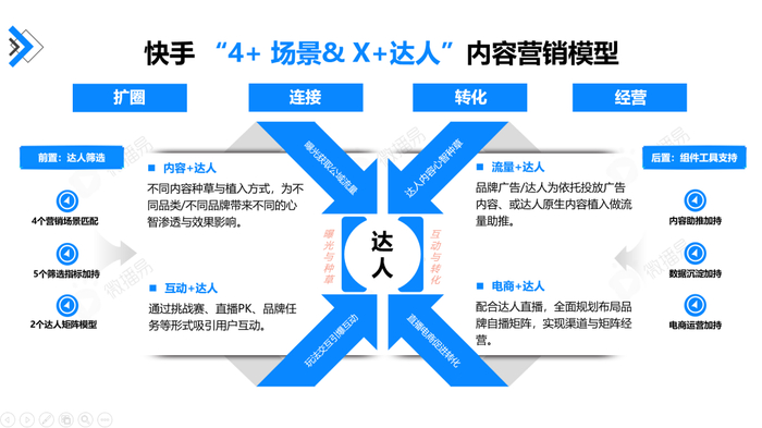 报告提出“4+场景&X+达人”的达人营销策略,4+指的是新市井商业从流量到销量、从品牌到经营,提供由浅入深的全链营销赋能,覆盖客户的主要营销场景。X+指的是快手平台的基建流量、优质内容、产品形式、电商经营。而达人则是支撑4+,配合X+的核心所在。