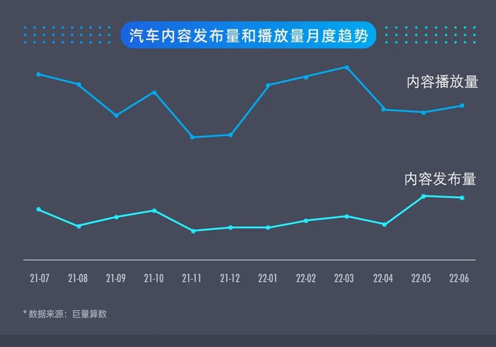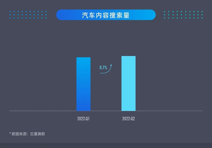月度搜索次数呈现持续上扬趋势,用户已经不满足于单纯被动浏览内容,对汽车内容的主动搜索次数持续增加,用户的主动搜索意愿强烈。根据巨量算数统计,在2022年第二季度汽车内容播放量环比下降的背景下,搜索次数较第一季度相比却实现了微增0.7%。