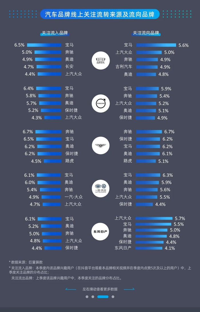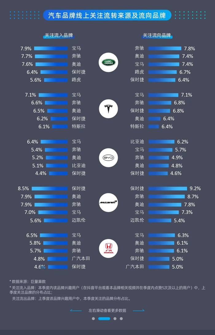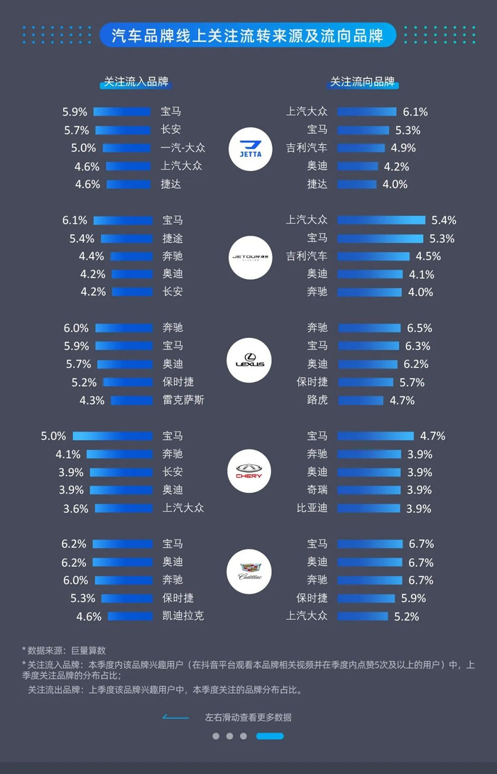 从线上关注流转分析来看,豪华品牌依旧占据了大部分品牌的关注流入和关注流向品牌榜单的第一位。其中,宝马、奔驰、奥迪、保时捷、路虎等品牌关注用户中,本品牌在流入和流出的排名均靠前,用户关注忠诚度相对较高;自主品牌中,比亚迪关注用户的来源和去向也表现出较高的关注忠诚度;合资品牌中,上汽大众的本品牌流入流出排名亦靠前。