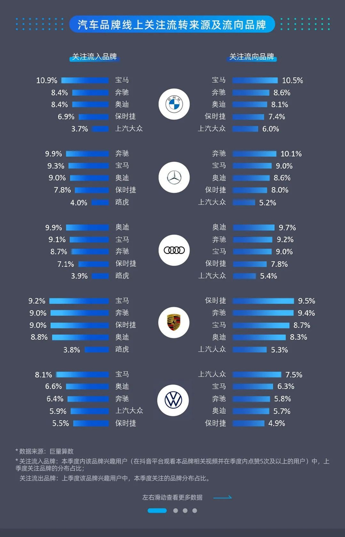 从品牌的用户资产来看,综合品牌账号的用户主动行为数据计算(包括视频内容的点赞、评论、分享),豪华品牌的用户兴趣度相对更高,其中宝马、奔驰、奥迪、保时捷及特斯拉占据头部前五位;一汽大众和五菱汽车依靠活跃的用户行为分别成为合资品牌和自主品牌的用户榜单领衔者。