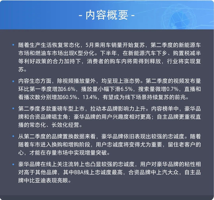 从消费端来看,在新能源汽车下乡、购置税减半等利好政策的合力加持下,让消费者的购车内需得到了极大程度的释放,也推动了汽车行业的强力复苏。随着政策红利的延续和发酵,下半年预计将延续增长态势,拉动汽车市场持续回暖,尤其新能源车渗透率也将进一步扩大。所以,在消费大潮来临时,如何把握用户的需求特征,进而进一步去引导用户,线上生态作为线下消费的晴雨表,其重要性不言而喻。