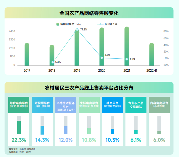 数字乡村建设逐步实现全链条的转型升级,带动农村居民在日常生活的方方面面享受到数字乡村的发展红利:电子商务的覆盖弥合了城乡居民在消费侧的沟壑、县域物流的网络的完善打通了农村快递物流的“最后一公里”、金融惠农助力乡村振兴走向快车道。 随着农村电商基建不断完善,在更多线上消费品走进农村的同时,农产品借助各电商平台也实现了“走出去”。电商平台积极响应乡村振兴号召,大力发展农产品市场,帮助打通农产品对外零售渠道。巨量算数整理商务部统计数据看到,2022年上半年全国农产品网络零售额达2506.7亿元,同比增长11.2%,农产品线上零售市场持续恢复从农村居民线上售卖三农产品的平台分布来看,占比最大的仍然是综合电商平台,其次为抖音等短视频平台。
