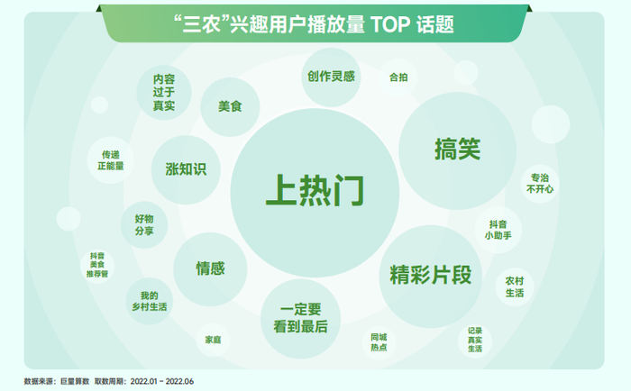 “三农”兴趣用户特征鲜明,他们热爱生活,有着积极的人生态度,在抖音上,传递正能量、观看搞笑视频,记录生活的同时也不忘分享乡村美景和优质好物,“我的乡村生活”、“精彩片段”、“传递正能量”、“分享好物”等均为2022年上半年的热门话题。 此外,“三农”兴趣用户对流量有着明确的需求,“上热门”、“同城热点”等均是他们关注较多的话题。通过搭载热点,制造热点等方式将优质的农产品带给更多的用户,已经成为抖音“三农”兴趣用户的长期需求。