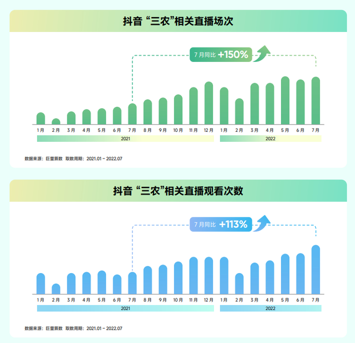 除短视频外,抖音直播电商机遇也吸引着“三农”主播的参与。巨量算数统计发现,2021年以来,抖音“三农”相关直播场次和观看次数持续增长,到2022年7月,直播场次同比增长150%,观看次数同比增长113%。