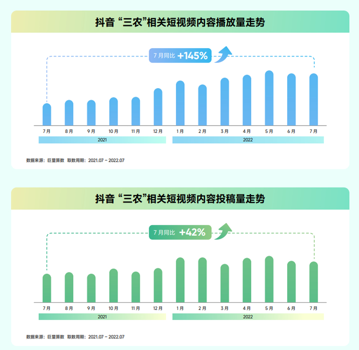 移动互联网的发展奠定了农村数字经济转型的基础,尤其是围绕视频化和电商化两大趋势下,农村的信息传播、电商销售、物流、特色旅游、数字金融等日益完善。 在供给端,农民们通过农产品销售、旅游民宿发展当地经济,增加个人收入,提升乡村消费力;在需求端,互联网消费的便利性让农民可以跨地域享受到更优质的商品,促进乡村消费升级。 视频化大幅降低了信息传递的门槛,让普通农民可以获取到平台上有趣的内容,同时,也能将农村、农产品信息通过平台进行广泛地传播。借助抖音兴趣电商,越来越多的农产品被看到,被销往全国各地。据巨量算数数据显示,抖音用户对“三农”相关内容有着浓厚的兴趣,2022年7月,相关短视频内容播放量、投稿量同比上年分别增长了145%和42%。播放量增速显著高于投稿量,巨量算数分析,“三农”相关内容需求旺盛,整体处于供不应求的阶段。