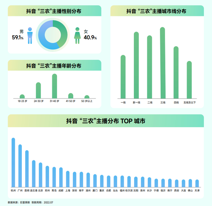 巨量算数分析发现,“三农”主播多分布在农产品货源地,更便于展示农作物的生长和生产环境,同时为直播提供了大量的场景和素材。此外,电商发达城市,也是主播的主要分布地,良好的电商基础设施和营商环境,为主播们提供了诸多便利。