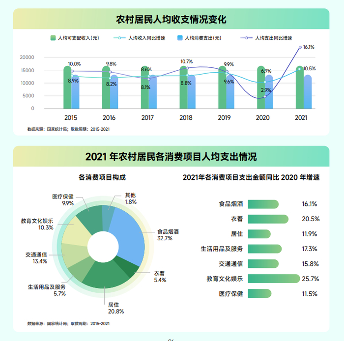 “十四五”规划纲要明确提出“坚持农业农村优先发展,全面推进乡村振兴”“加快推进数字乡村建设”,标志着我国乡村建设进入数字驱动新阶段;而随着乡村数字基建的不断完善,数字消费的影响力和覆盖范围逐渐扩大,数字化生活方式正在农村地区形成,乡村数字经济的潜力将得到快速释放。 巨量算数整理发现,农村居民的收入水平持续提升,消费结构逐渐发生改变的同时,消费升级的需求日益旺盛,电商等数字平台将成为农村消费的重要渠道。