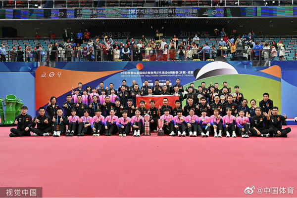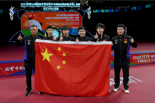 第56届国际乒联世界乒乓球团体赛于10月9号在成都闭幕,在8号晚间女乒决赛中,中国队3比0横扫日本队,夺成都世乒赛女团冠军后,实现五连冠的赛前目标,历史上第22次捧起女团冠军奖杯考比伦杯。随后在9号晚间进行的男乒决赛中,中国队以3比0战胜德国队,夺得冠军,并实现十连冠!