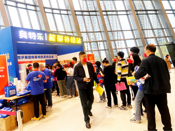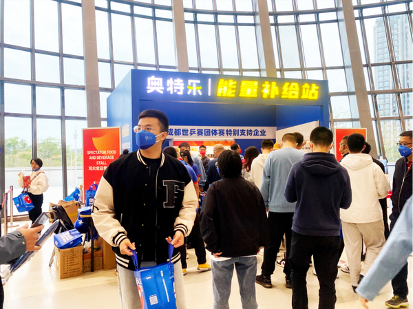 世界乒乓球锦标赛是国际乒乓球联合会主办的一项最高水平的世界乒乓球大赛,具有广泛的影响。此次成都世乒赛团体赛比赛中,来自成都的硬折扣连锁品牌奥特乐,作为本次比赛唯一的官方零售类支持企业,分别在观赛区二楼和四楼通道处设立两个能量补给站,为组织观众区观众和赛事部分现场工作人员提供食品供给服务。同时,奥特乐能量补给站,还为观众提供加油手环、加油贴纸、环保购物袋等免费助力物料,积极营造世乒氛围,在比赛现场,随处可见观众带着奥特乐的加油物料为国乒队员加油。