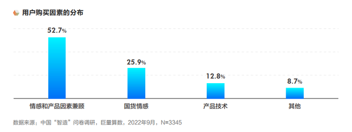 除了质量好科技感强,情感诉求也是用户选择中国制造品牌的重要因素。巨量算数调研数据显示,在中国制造产品的购买因素中,有52.7%的用户兼顾情感和产品因素,用户通过“理性”+“感性”双重因素来选购产品。
