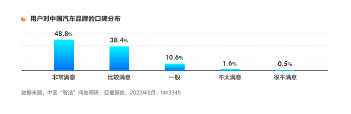 除新能源赛道外,技术层面的智能赛道更是汽车革命时代的核心。中国自主品牌通过合作和自研的模式,实现智能网联技术搭载,让“制造”变为“智造”,在用户的口碑中,认为中国汽车品牌“产品质量好”、“科技感强”的用户分别占据44.0%、38.0%,品牌逐渐实现从“低廉价格”到“高度智能”的转变。