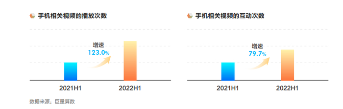 从抖音数据来看,用户对国产手机品牌表现出强烈的兴趣和喜爱,国产手机相关视频播放量持续上扬的同时,用户也愿意通过点赞、评论等方式进行互动,2022年上半年的互动量同比也有79.7%的增长。