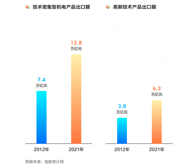 随着技术革新,中国制造业产品的出口由以劳动密集型行业为主,逐渐转变成了以技术密集型行业为主。技术密集型的机电产品和高新技术产品出口额分别由2012年的7.4万亿元、3.8万亿元增长到2021年的12.8万亿元、6.3万亿元。