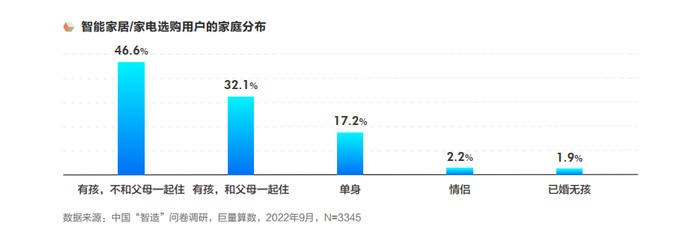 根据巨量算数调研,相对单身人士而言,选购智能家居/家电更多为家庭用户,其中“有孩子不和父母住”的用户占比高达46.6%,而“有孩子和父母一起住”的用户也超过30%。