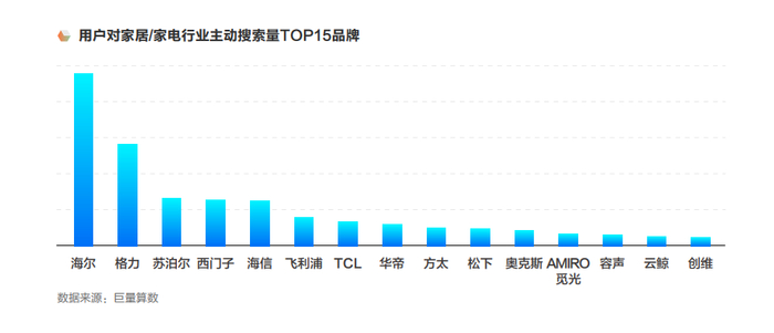 巨量算数数据显示,越来越多的用户通过搜索实现对中国品牌家居/家电相关的了解。在品牌搜索量TOP15榜单中,除西门子、飞利浦、松下,其余12个品牌均为中国品牌。消费者对中国品牌的兴趣和热爱,通过家居/家电的主动搜索行为体现的淋漓尽致。