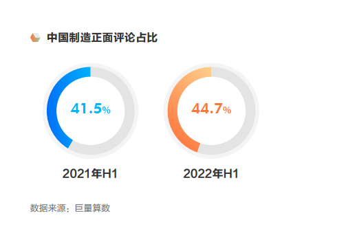 用户兴趣渐浓,选购标准由“理性”到“感性”升华巨量算数数据显示,在抖音平台,用户对中国制造相关内容的关注和兴趣均呈现上扬态势,同时,对中国制造品牌的正面评论占比也由2021年的41.5%,提升至2022年上半年的44.7%。正面口碑的扩大,表明用户对中国制造品牌的好感度进一步提升。