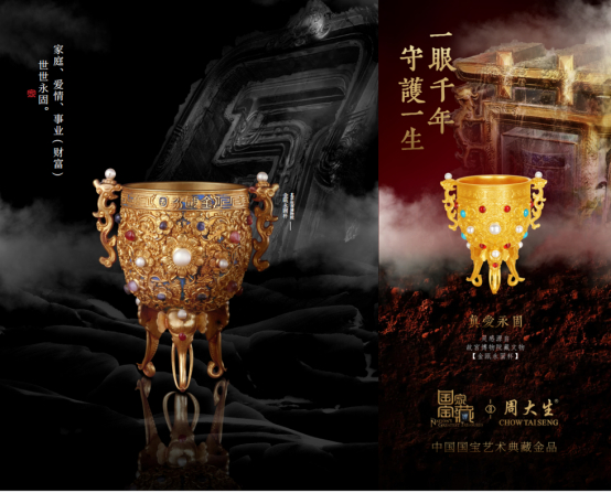 “真爱永固”以中国宫廷古法制金工艺还原其之形态,并集古法黄金錾刻、珐琅、镶嵌工艺之大乘,精雕细琢,潜心打造可以传世的礼器,寓意着“金樽永满,财源永在”,合为一对更是婚嫁吉物,表达着“爱情永恒,繁盛永固”的幸福祝愿。