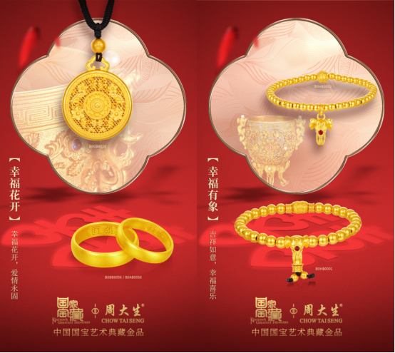 周大生珠宝此次能迅速构建品牌国庆产品战略且获得一致好评主要在于两点,一方面是基于品牌明锐的市场洞察,将选品目光精准的定位在黄金品类上,据相关数据显示,近年来黄金珠宝销量逐年递增,且在2021年国庆期间,整体销量就比日常增长了50%-60%,与2020年同比增长了30%,已然成为了拉动国庆经济的主力军团之一。另一方面则是颠覆以往的研创理念,从品牌近日释放的国庆产品物料中,我们不难发现,无论是中国婚嫁文创系列“幸福花嫁”还是中国国宝艺术典藏金品“国家宝藏”皆乘国潮新风,链接中国千年优秀传统文化,从其所蕴含的故事与情感中汲取典型的元素与符号,赋予产品富有源源不断的生命力,并融合黄金创新工艺和现代珠宝艺术设计,将优秀传统文化和千年情感文化注入珠宝当中,全新演绎了黄金文创产品的潮流概念,同时也赋予了深厚情感新时代内涵,传递出对幸福美满婚姻的期许与祝福,完美的满足了新一代消费者对黄金珠宝“时尚潮搭、情感表达、保值投资”等多元化的价值需求。