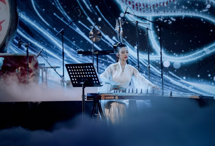 悠扬的二胡缓缓起韵,光影斑驳的书扉前,一袭白衣的演奏家素净典雅,玉立飞雪中。弓弦切磋之际,悠扬的旋律随着雪花飞舞。颗粒度饱满的琵琶加入演出,转轴拨弦间,大珠小珠落玉盘。铿锵有力的中国鼓随后接管耳朵,舞台也由纯净的白色转入热烈的大红。大开大合、律动人心。紧接着出场的是的竹笛和古筝,仿若让人置身绿意盎然的灵动山野间。五音集结之后,一场精彩纷呈的国乐盛典正式开幕……