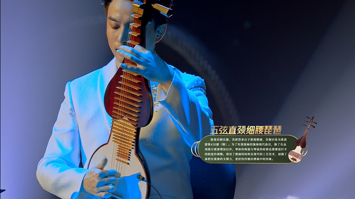 既要最大程度还原,又要满足当下的音乐审美。团队成员们尽了最大的努力。这其中,有对失传乐器的守正创新。云歌会上,国乐团演奏的五弦直颈细腰琵琶与壁画中的造型一致。但因其品数只有四品,对于现代的音乐来说,导致的结果就是音域过于狭窄,作曲家无法发挥。在和专家们商议后,在定制时将其音域扩展成满足当代音乐的演奏需求。