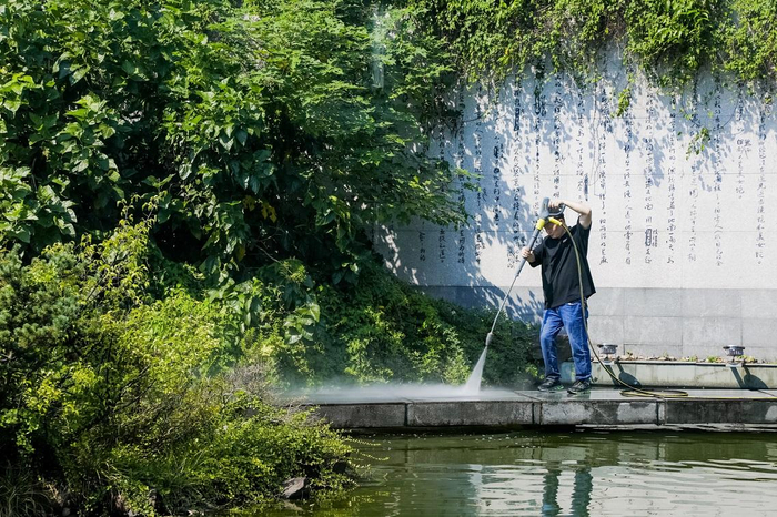 一踏上广场,入眼便是矗立于此的一堵花岗岩景墙,上方不仅镌刻有“鲁迅故里”四个大字,还有写意的街景风貌,右侧则是手夹香烟目光深邃的鲁迅画像。针对景墙表面的水痕和苔藓,卡赫选用性能强劲、稳定高效的冷水高压清洗机HD 10/25进行快速冲洗,效果十分显著。至于附着在百草园、三味书屋以及景观石桥上的顽固污渍,卡赫团队则使用高压清洗机HD 6/15 C和HD 6/15-4以合适的冲击压力,在不使用任何化学清洁剂的情况下进行清洗。