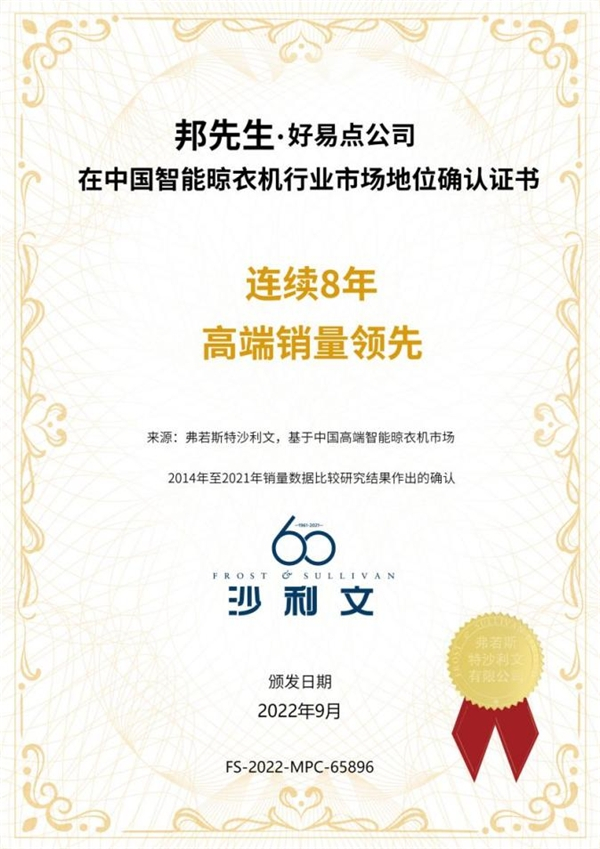 全球权威咨询公司弗若斯特沙利文(Frost & Sullivan,以下简称“沙利文”)基于对中国高端智能晾衣机市场长期的深度调研与行业研究,以及通过对2014年至2021年销量数据比较研究结果做出的确认,授予邦先生品牌在中国智能晾衣机行业市场地位确认证书,认定邦先生高端智能晾衣机在中国市场“连续8年 高端销量领先”。