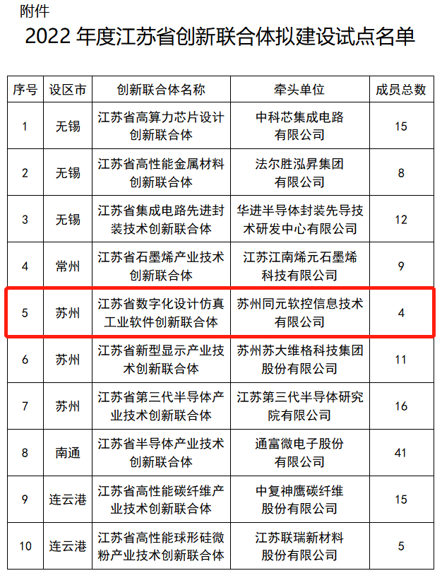 近日,江苏省科技厅公示了2022年度江苏省创新联合体拟建设试点名单,苏州同元软控信息技术有限公司牵头建设的江苏省数字化设计仿真工业软件创新联合体入选。