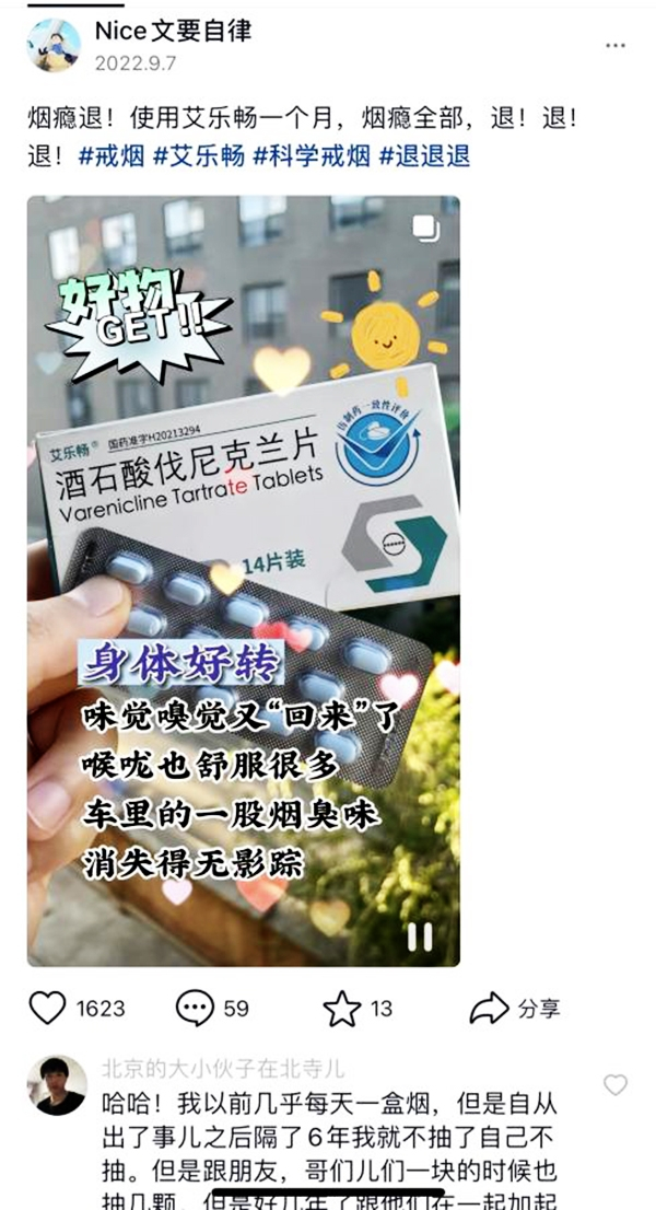 2022年4月,首个国产戒烟药艾乐畅已经上市,上市后许多烟民通过京东以及天猫上的大药房纷纷自发购买,患者体验显示,用药十天左右抽烟口感变差,此后逐渐脱离烟瘾的控制,受到市场广泛关注。