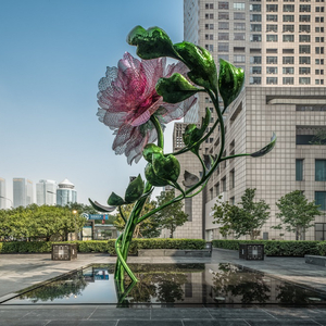 《倚春风》延续了艺术家郑路对新能源艺术的探索,采取超大尺寸的牡丹造型,作品整体采用不锈钢结构,牡丹叶片表面附着太阳能板单元,用以吸收太阳能,并在夜间使叶片上的LED灯光亮起。艺术家从中国古典牡丹绘画中汲取造型灵感,以具有当代性和时代感的材料和语言重新演绎,使它具有纪念碑式的尺寸,又灵动婀娜,极具东方韵味。在CBD的高楼大厦之间,迎风摇曳,为城市带来出人意料的美感和想象力。
