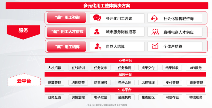 报告指出,多元化用工管理面向具备多元化用工需求的企业提供服务,帮助企业解 决多元化用工管理模式下的诸多痛点。主要从财税管理、人才和交易等串联起整个生态链的各参与方,包括劳动者、 需求企业和第三方机构。多元化用工从服务和云平台两大维度为企业提供整体解决方案。
