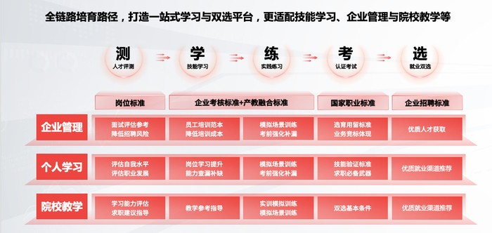 巨量认证依据不同职业周期内的初中高阶人员的培养目标和技能要求提供差异化的解决方案,以“测-学-练-考-选”等培养路径来帮助学员通过测评了解个人真实水平,并依据评测报告给予的建议进行有针对性的学习和查漏补缺;同时也帮助企业在员工技能培训、能力评价及就业双选等方面降本增效,提供有力的人才发展工具,同时也帮助院校提供来自产业实践的教材、教法和工具。
