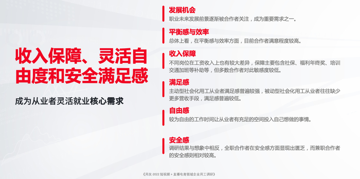 同时,发展机会、收入的保障、灵活自由度和安全满足感等成为从业者就业的核心需求,吸引众多合作者开拓新的就业方式。