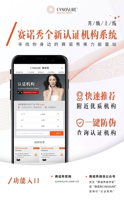 要想安全变美,专业机构和原版仪器缺一不可。为了帮助广大求美者更加快捷地找到官方认证机构,体验5D胶原光,赛诺秀近期升级上线了全新的认证机构系统,一键为求美者推荐身边优质认证机构。可以通过赛诺秀官网或赛诺秀官方公众号”赛诺秀美学家”的认证机构板块,高效便捷进行防伪验证,一起安心变美吧!