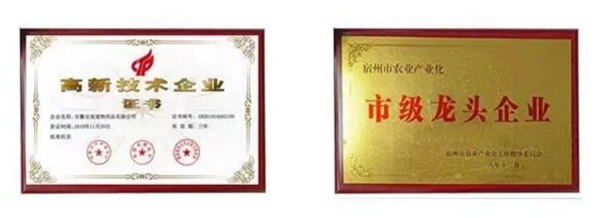 除了优越地理位置带来的隐性红利之外,安宠工厂自身实力不可小觑。安宠在最近五年的发展中,专注于宠物食品的研发和生产,先后获得“国家级高新技术企业”授牌,安徽省宿州市“农业产业化龙头企业”授牌。企业荣誉的背后,是财力、人力、物力的巨大付出。据安宠官方透露,宿州萧县工厂总投资超2亿元,厂区占地50000㎡,其中智能制造厂房30000㎡,研发中心1000㎡,现代化仓储物流区20000㎡。