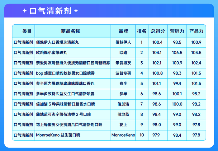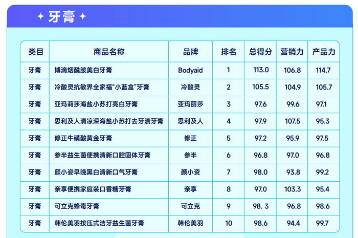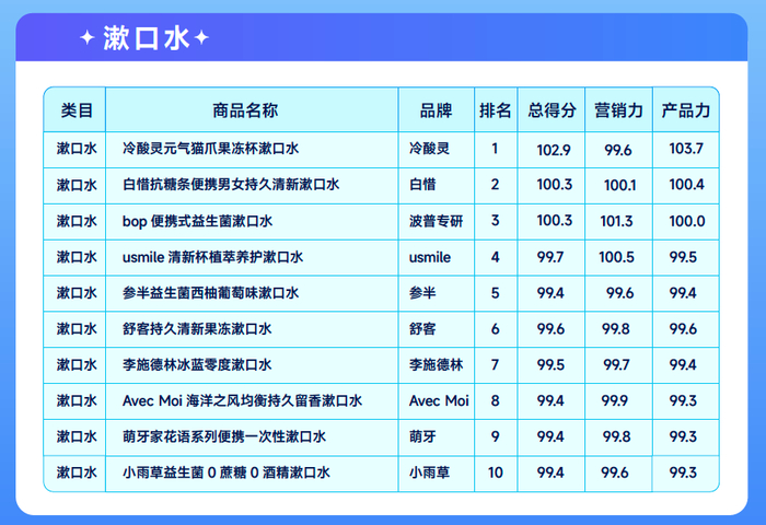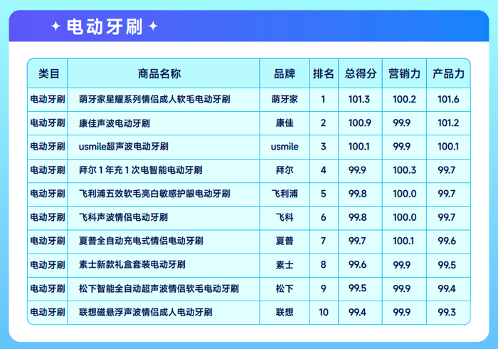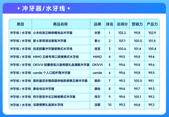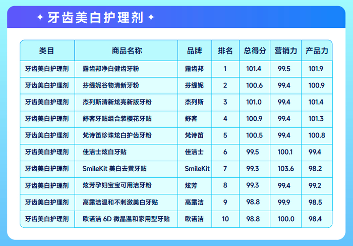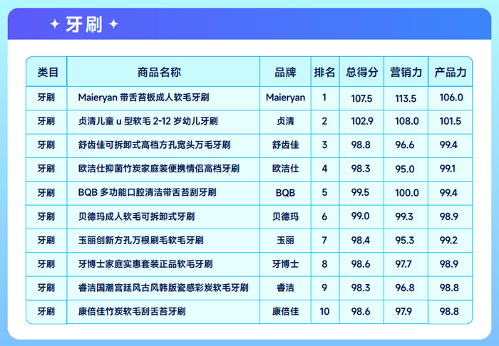 口腔护理赛道七大叶子类目 TOP10爆品榜单(排名+总分值)