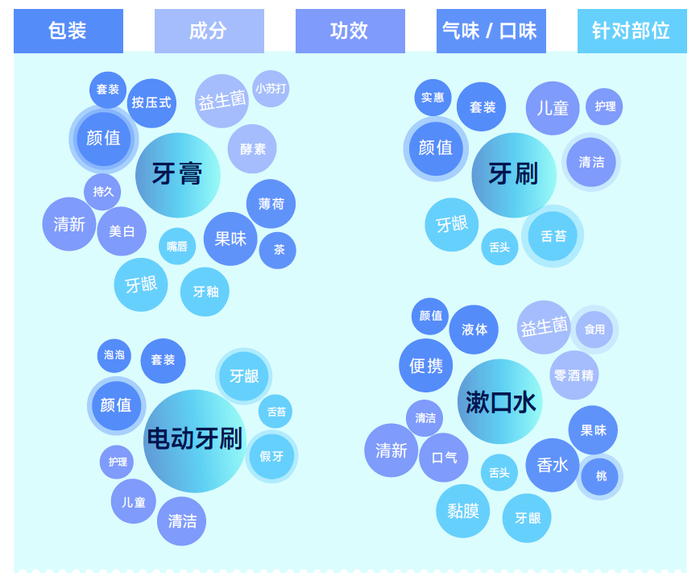 不同口腔护理品类在成分、功效、气味/口味、包装、细分部位等维度上的热门机会点局势分布