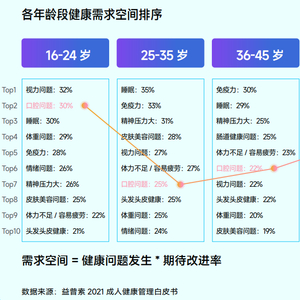 中国消费者口腔健康素养水平逐渐提高,各年龄段消费者口腔护理需求增强。口腔护理问题已成为消费者最容易发生的、影响消费者工作生活的健康问题之一,重视程度仅次于睡眠、免疫力等议题。