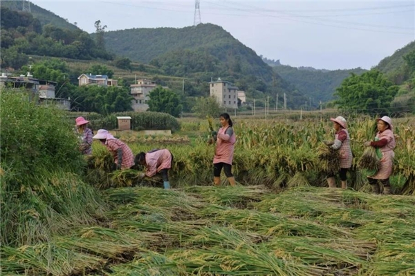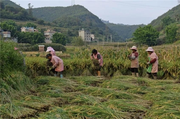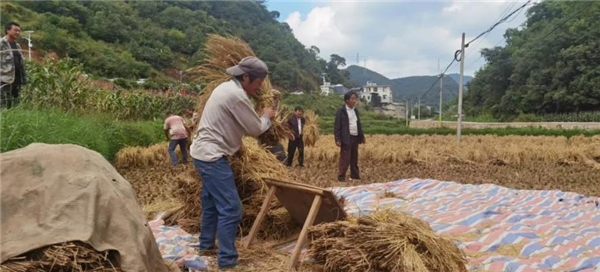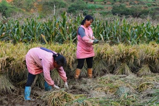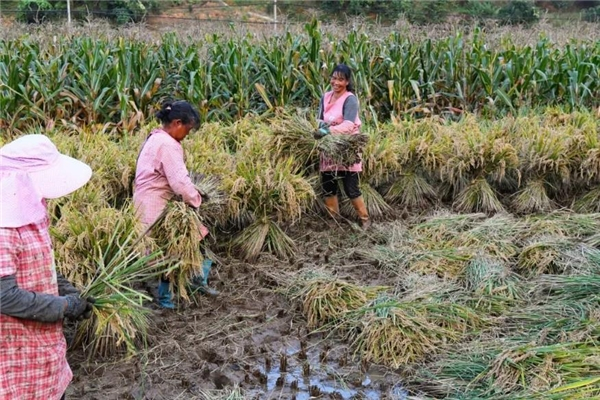 金秋十月,五华区瓦恭社区村边稻田里一片金灿灿、沉甸甸的穗子压弯了稻秆,村民们弯着腰收割成熟的稻谷。