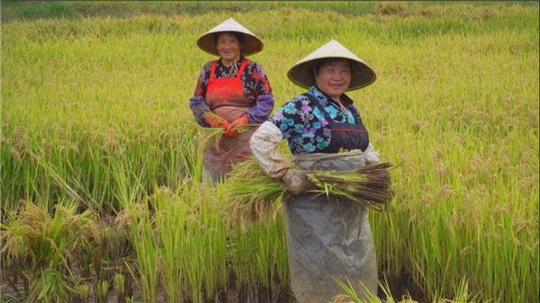 村民张进芝娴熟地挥动镰刀,身后留下一行整齐的稻茬。张进芝笑着告诉记者,别看她们种的面积不大,产值可不低,取得有机认证的大米一公斤能卖20多元,价格是以前的几倍,今年水稻还长的特别好,收成好收入就更多,干起活来都特别开心。